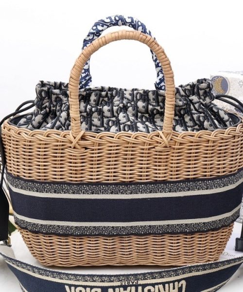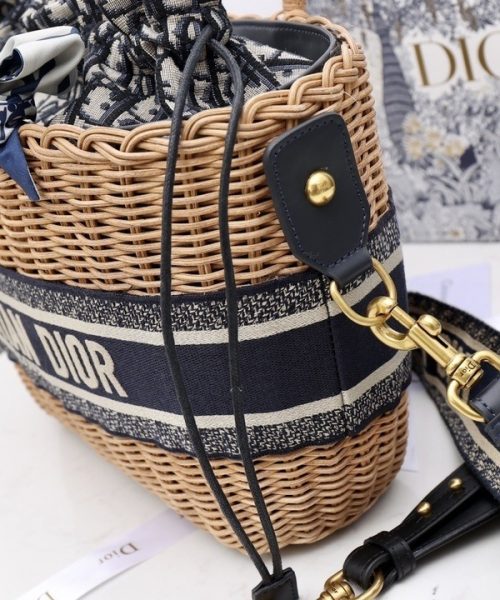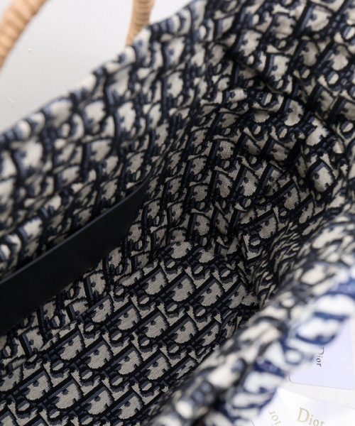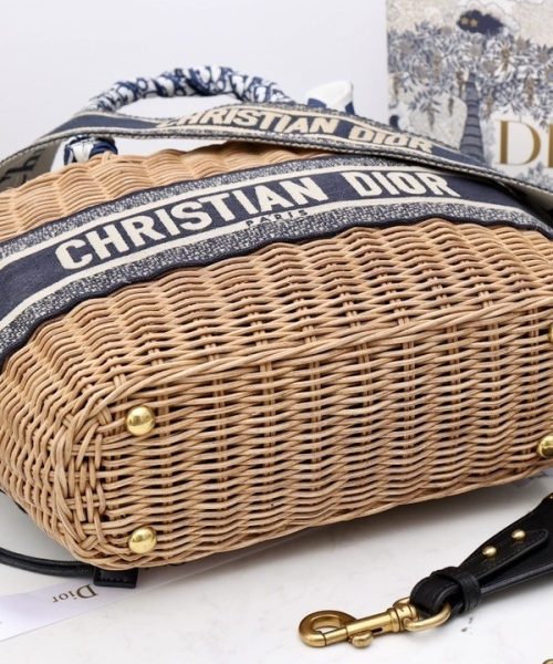 The Lady Dior handbag epitomizes Dior’s vision of elegance and beauty. The timeless creation is traditionally crafted in natural hand-woven wicker and exemplifies Dior’s savoir-faire. The bag features a blue Dior Oblique jacquard interior pouch with a drawstring as well as a ‘CHRISTIAN DIOR PARIS’ embroidered band on the front. Antique gold-finish metal ‘D.I.O.R.’ charms offer an elegant allure. The medium Lady Dior bag, with its wide, removable leather shoulder strap, can be carried by hand or worn crossbody.