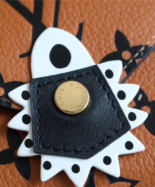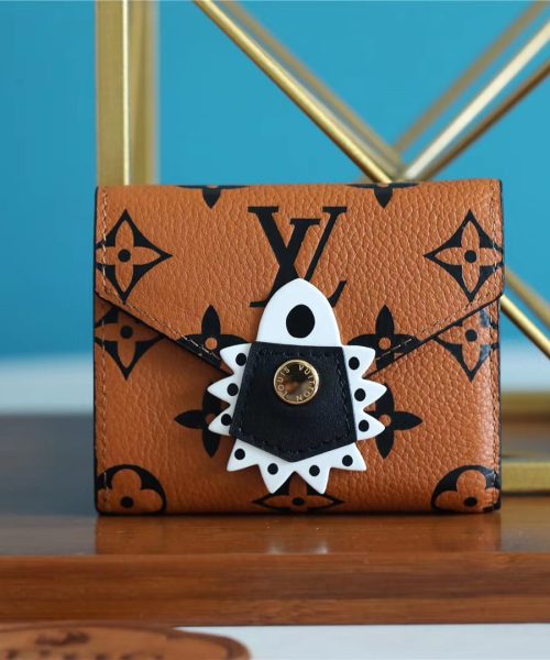 For the LV Crafty collection, the tiny Zoé wallet in Caramel-colored Monogram Empreinte is printed in black with Louis Vuitton’s iconic Monogram pattern. This collection, which includes accessories, ready-to-wear and goods, was inspired by graphic effects and craft techniques – hence the crafted detail around the wallet’s press-stud closure.