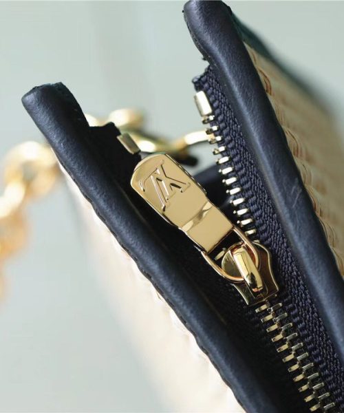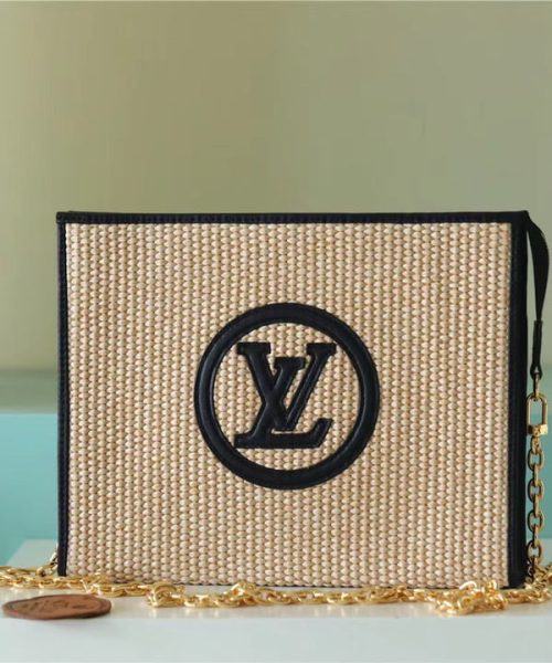 The Toiletry Pouch on Chain is crafted from natural raffia, complemented by black for the trim and LV Circle logo on the side. This model was inspired by the cosmetic Toiletry Pouch, created in 1901, which Louis Vuitton clients also used as a clutch. This reworked design has a removable, gold-tone chain for hand or shoulder carry.