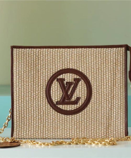 The Toiletry Pouch on Chain is crafted from natural raffia, complemented by black for the trim and LV Circle logo on the side. This model was inspired by the cosmetic Toiletry Pouch, created in 1901, which Louis Vuitton clients also used as a clutch. This reworked design has a removable, gold-tone chain for hand or shoulder carry.