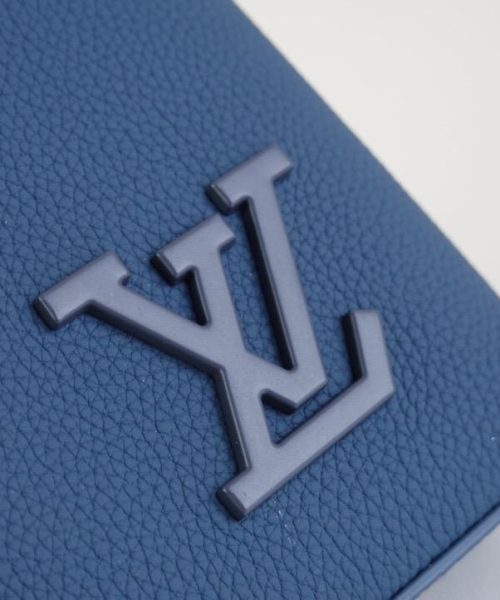 The iPad Pouch is the chic way to carry a tablet computer and other small items. This version is crafted in blue Aerogram, fine and supple like an old-fashioned postal aerogram, enhanced with a customizable label tag and the “LV” signature in tone-on-tone metal. A secure zipped closure and removable strap make it a user-friendly everyday accessory.