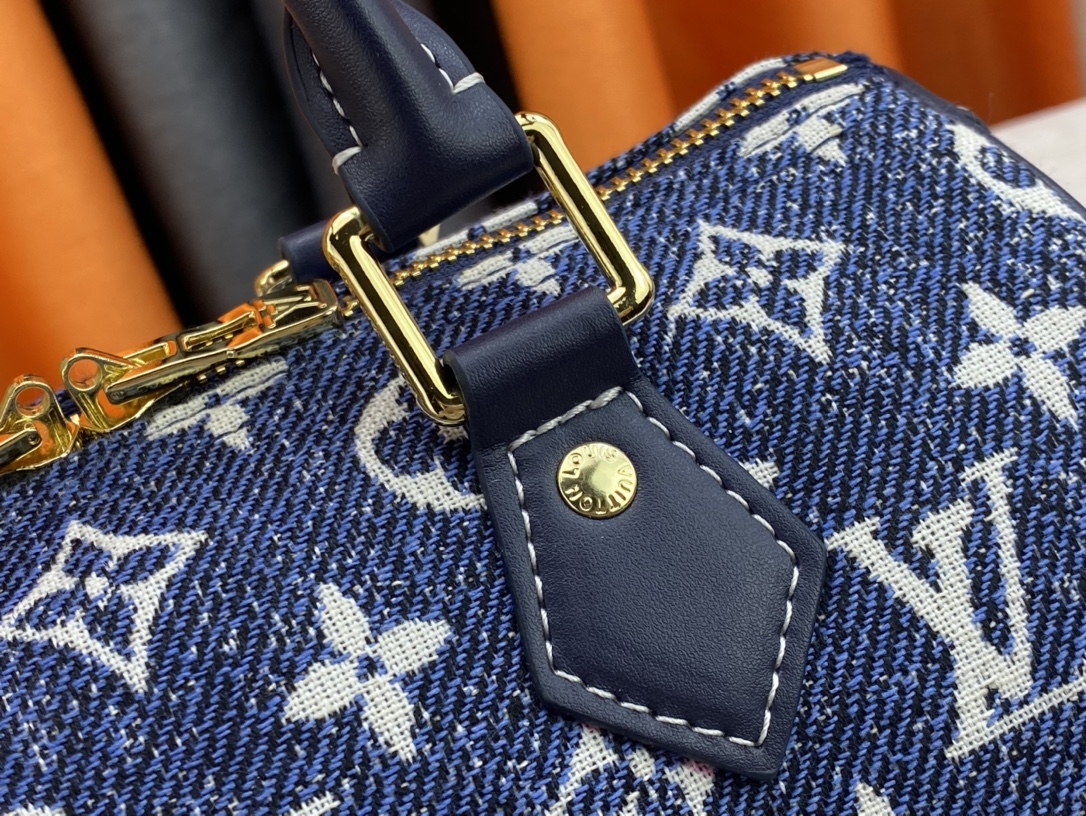 - The Speedy Bandoulière 25 handbag is made from Monogram denim jacquard for a casually fashionable feel. The faded blue is complemented by the tone-on-tone darker blue trim and white stitching. The jacquard weave creates a Monogram pattern on the fabric that will not fade over time.