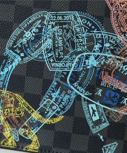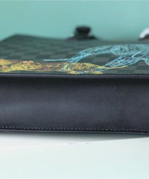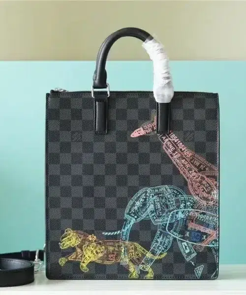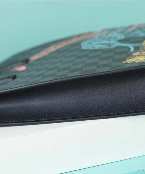 A slim but functional men’s carryall, the Sac Plat Cross bag is made from Damier Graphite canvas with trim. The Damier checkerboard is decorated with a print of wild animals made from an assortment of what looks like passport stamps in pastel colors. This bag has rolled-leather top handles and a removable strap.